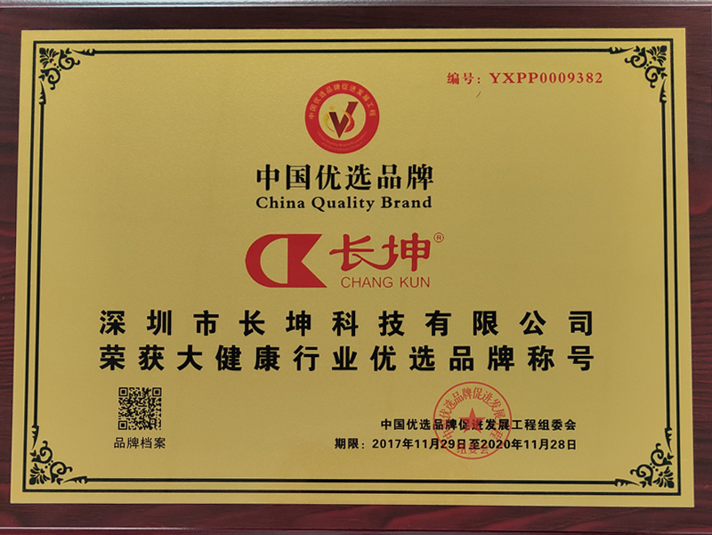 2017年12月,深圳市長坤科技有限公司成功被中國優(yōu)選品牌促進發(fā)展工程選中,評選為“中國優(yōu)選品牌”,并授予其“大健康”行業優(yōu)選品牌稱號,以茲鼓勵。